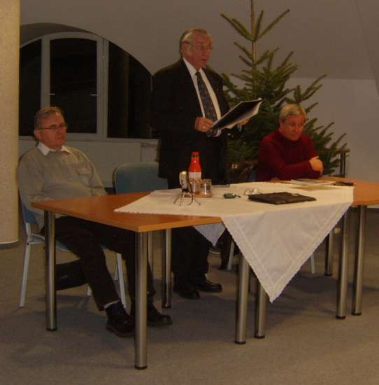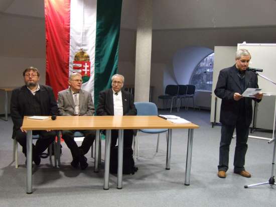 Az előadói asztalnál a sorozat fő szervezői, Kiss László és Rajnai Miklós.