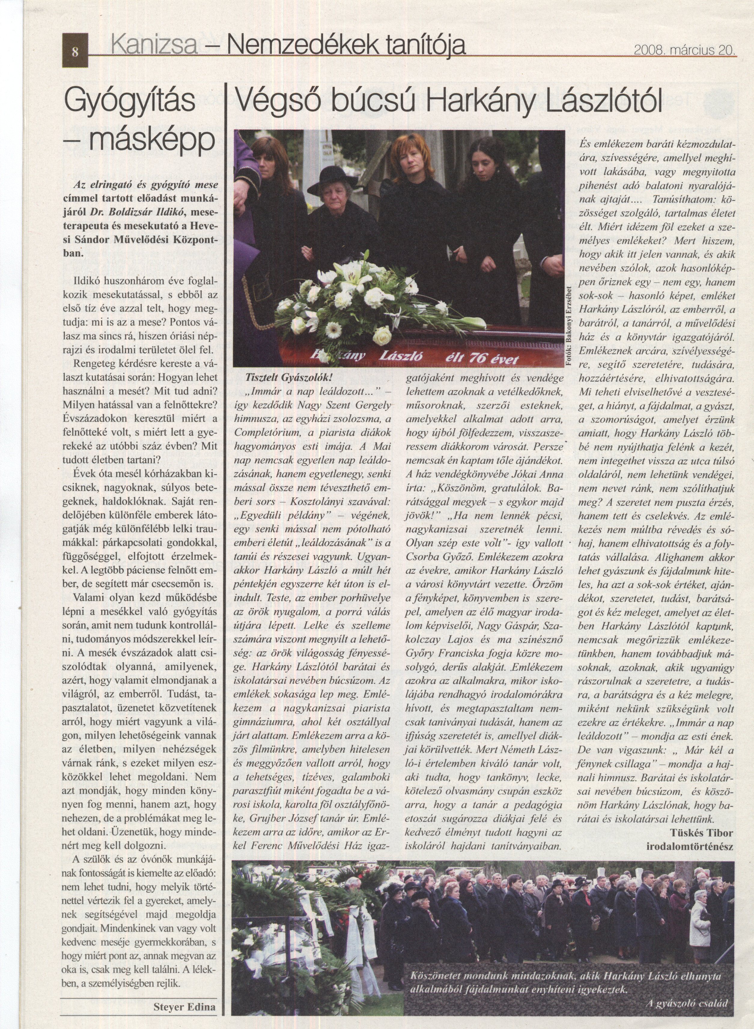 A temető a csend, a béke, a nyugalom és a meghitt emlékezés otthona. Mi most emlékezni jöttünk ide. Emlékezni Harkány Lászlóra, városunk díszpolgárára, a nagyra becsült tanárra, a szerető apára és nagyapára, a barátra, a köztiszteletben álló közösségi emberre.