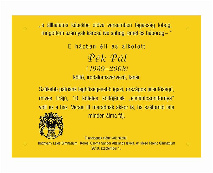 Az Ady u. 14. második emeleti lakásában lakott Pék Pál és édesanyja utoljára. 2010-ben táblával jelölte meg az épületet Nagykanizsa Megyei Jogú Város, a táblát Balogh László az OKISB elnöke avatta fel, a tábla az ő tervei alapján készült. Személyes kapcsolatáról olvasható a Pék Pál Breviáriumban.