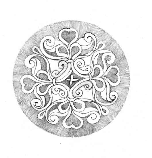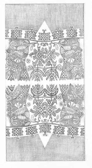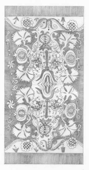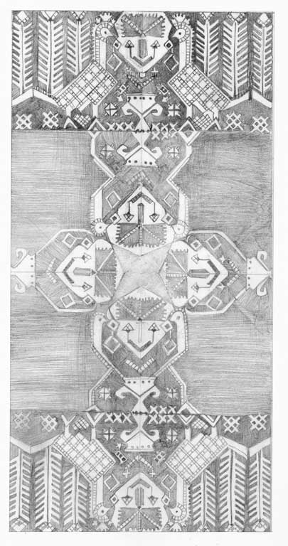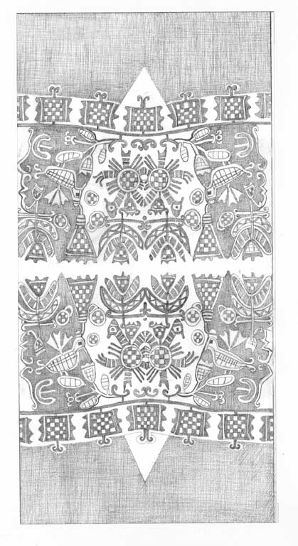 Az alapmotívum, mely csak ismétlődik, a leszakított viráginda a hagyomány szerint halált jelent. A halak csillagkép ősi jelét rajzolja ki, az alsó majdnem szimmetrikus, de mégsem azonos viráginda. Érzékletesen jelképezi ez az ingatag, érzelmekben kacskaringós életutat bejáró ember sorsvonalát. (A halnak a virágok fölötti pont a szeme, a virág a kopoltyúja, a népi ábrázolásokban gyakorta használt „cet” formájú vonalvezetéssel.) A halak jegyében a halálról és az érzelmek hallhatatlanságáról elképzelt jelképeket láthatjuk.