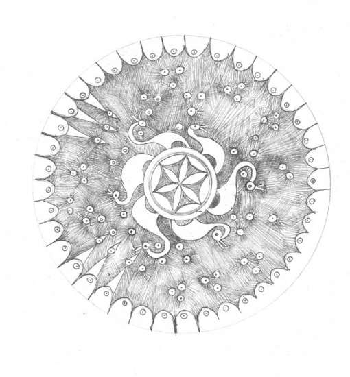 Jobboldalon a tejút központját látjuk forgó rózsa képében. Ahogy örvénylik, csillaglényünk földre száll.