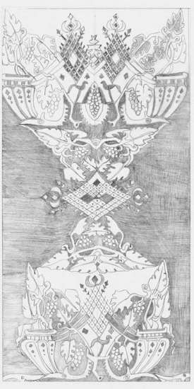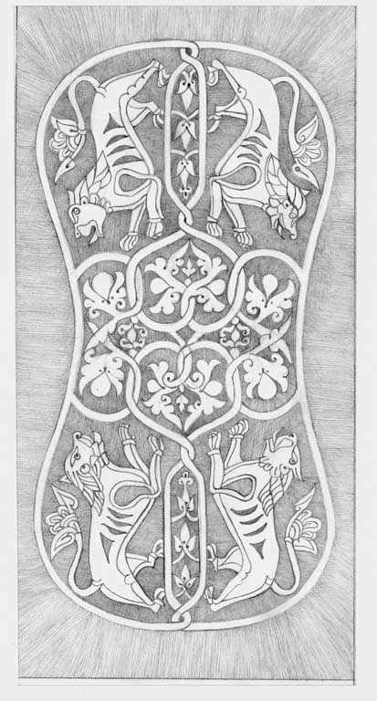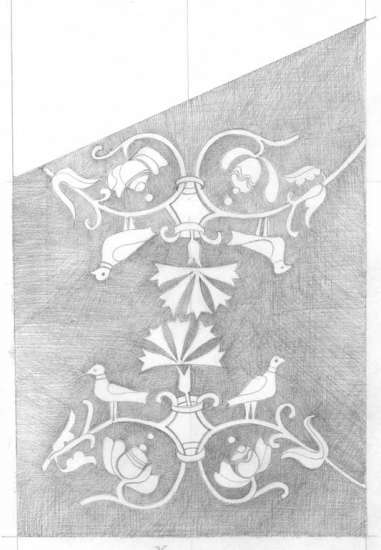 A kapcsolódó két inda nagy és kis hajtása között felfényesedik egy urna. Az urna a háttér síkjából jön elő, (szinte a másvilágból) fénnyel feltöltve. Ettől a ténytől vázájává válik egy fényre nyílt nagy-nagy szegfűvirágnak. Most már úgy tűnik, mintha ezt őrizné a kettő másvilágra kitekintő madár, akiről tudjuk, hogy az érzelmeket megjelenítő lélekjelző állata. Mivel teljesen egyvonalban vannak az urnával, együvé is tartoznak, - s a hagyomány szerint - átadják, átveszik egymásnak a halott ember minden érzelmét, amivel életében azonosult.