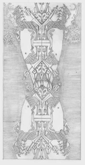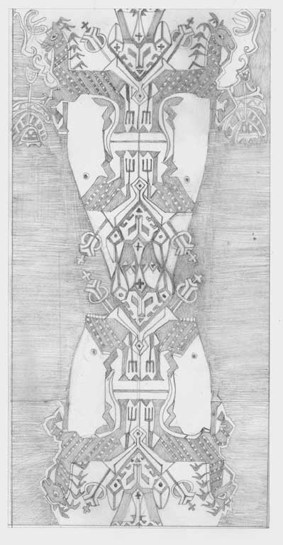 Szűkítsük össze szemünket, s figyeljük meg a szarvast és körbezárt világát! A szarvas két hátsó lába közt egy gyermekkel áldott anya bontakozik ki, a hátsó lába nyomvonalán pedig egy Napot szülő szoptatásra kész anya ül, aki a szarvas agancsával, mint saját szárnyával ékeskedik. (A hiedelemvilágban a rénszarvassal szoros kapcsolatot tartó Földanyánk tündéri gondoskodása jelenik így meg.)