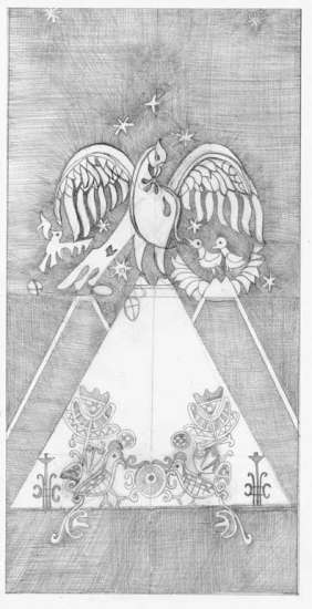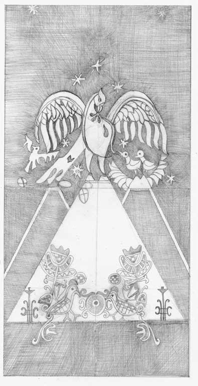 A pelikán körül csillagok, alatta pedig a szerelmespárt, magát a szerelmet jelképező két madár, két egymás felé hajló, forduló két tulipán (lehetne két majoránna is). Innen születetik meg a csillagok közé emelkedő, az anyagi világból kiragyogó anyai szeretet madara, a pelikán, és innen jutnak az égbe (talán a virágok gyökerénél megjelenő két magocskából) a pelikánfiak. A két erős fénysugár mellett jobbról és balról két gyertyatartó őrzi ezt a rendet.