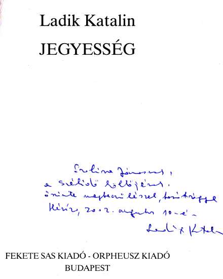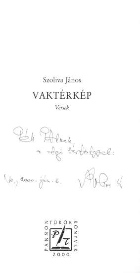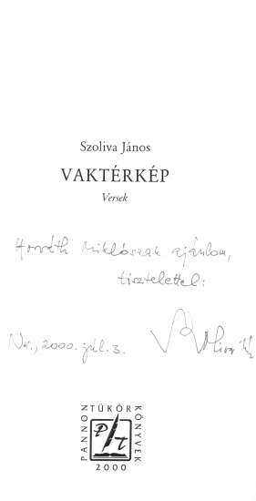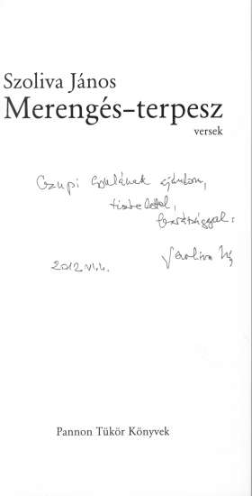 Szoliva Jánosnak a Szélidő költőjének őszinte megbecsüléssel, barátsággal.Hévíz, 2012. augusztus 10-énLadik Katalin |