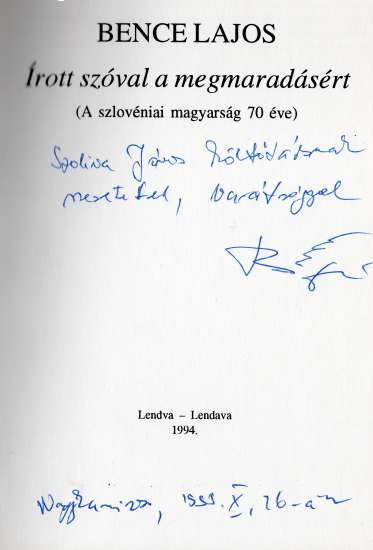 Szoliva Jánosnak és kedves házanépének barátsággal ajánlom.Nagy Gáspár |