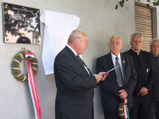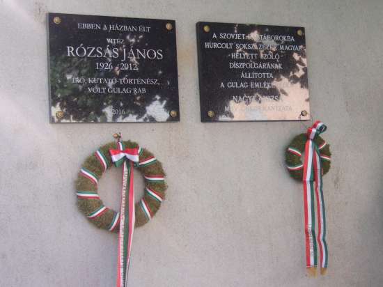 A tábla szövege: Ebben a házban élt vitéz Rózsás János (1926-2012) író, kutató-történész, volt GULAG rab