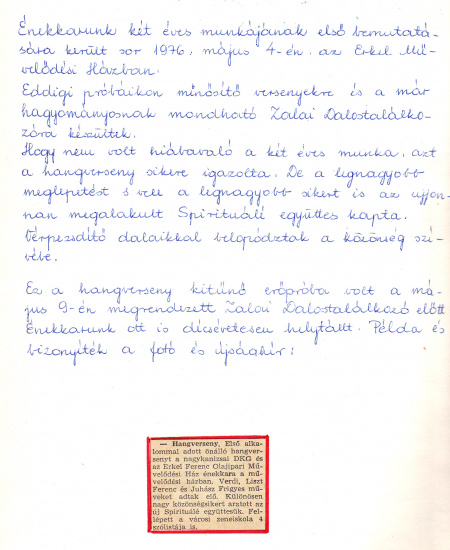 Ez a hangverseny kitűnő erőpróba volt a május 9-én megrendezett Zalai Dalostalálkozó előtt Énekkarunk ott is dicséretesen helyt állt. Példa és bizonyíték az újsághír: — Hangverseny. Első alkalommal adott önálló hangversenyt a nagykanizsai DKG és az Erkel Ferenc Olajipari Művelődési Ház énekkara a művelődési házban. Verdi, Liszt Ferenc és Juhász Frigyes műveket adtak elő. Különösen nagy közönségsikert aratott az új Spirituálé együttesük. Fellépett a városi zeneiskola 4 szólistája is. (Zalai hírlap, 1976. május 6. 8. oldal)